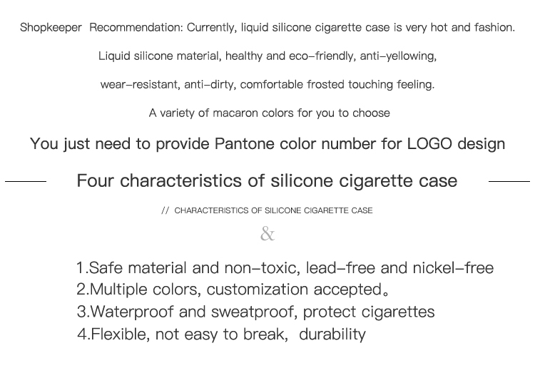 Silicone cigarette case made of environmentally friendly silicone processing, the surface can print their own patterns or LOGO! Feel good, soft deformation, not afraid of throwing, reusable, easy to clean. Is a good product to promote cigarettes and gift gifts!