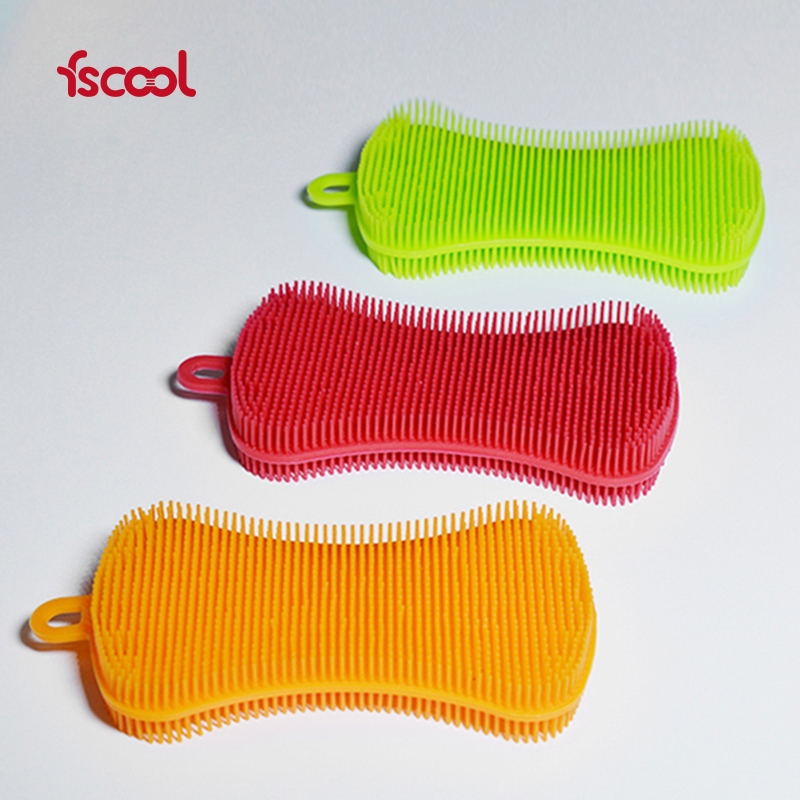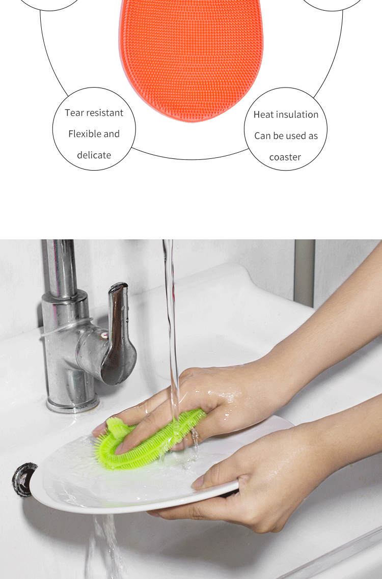 3, Double-sided with numerous intensive clean bristles, so that stains without escape, flexible, how to pull nor deformation, you can wash dishes, brush pots, clean vegetables and fruits, insulation mats and other multi-functional. Heat resistance is very good, can bring boiling water disinfection, with hole design, can be reused, safe and tasteless, non-oil, clean and no residue.