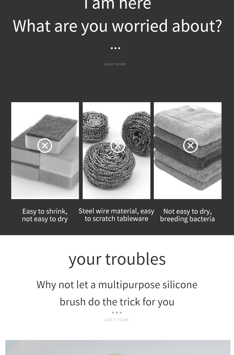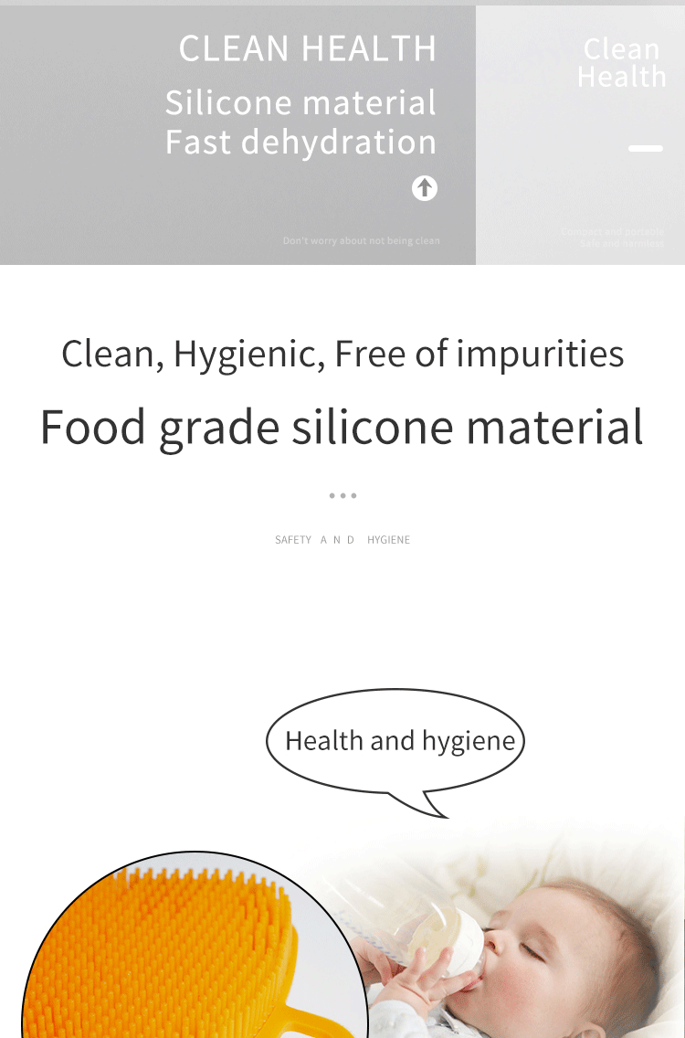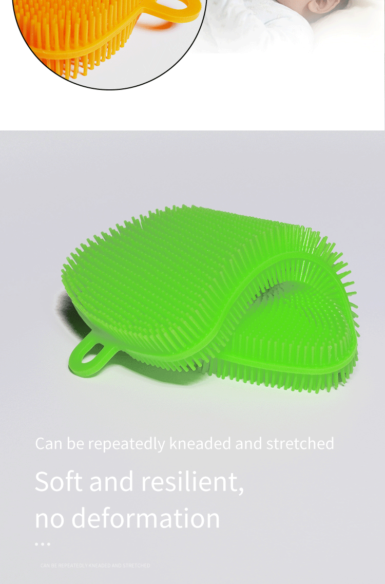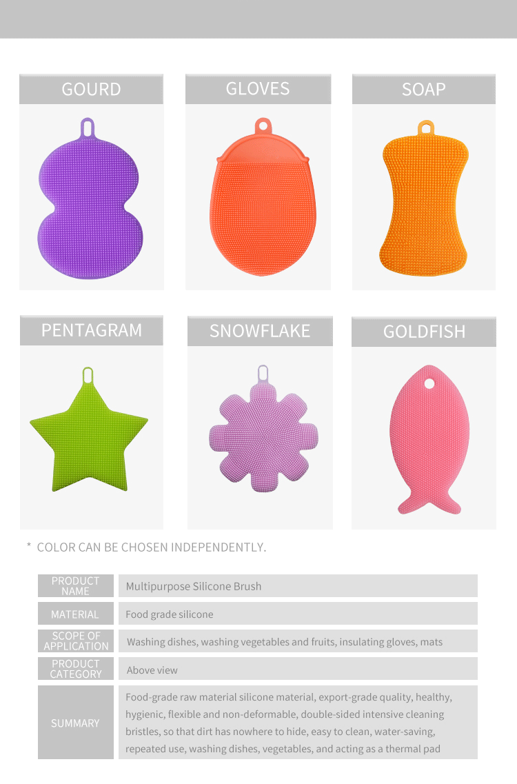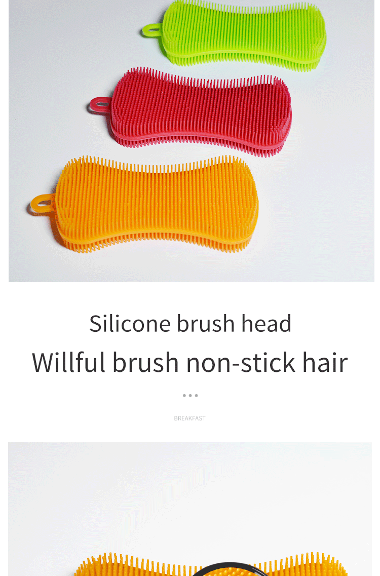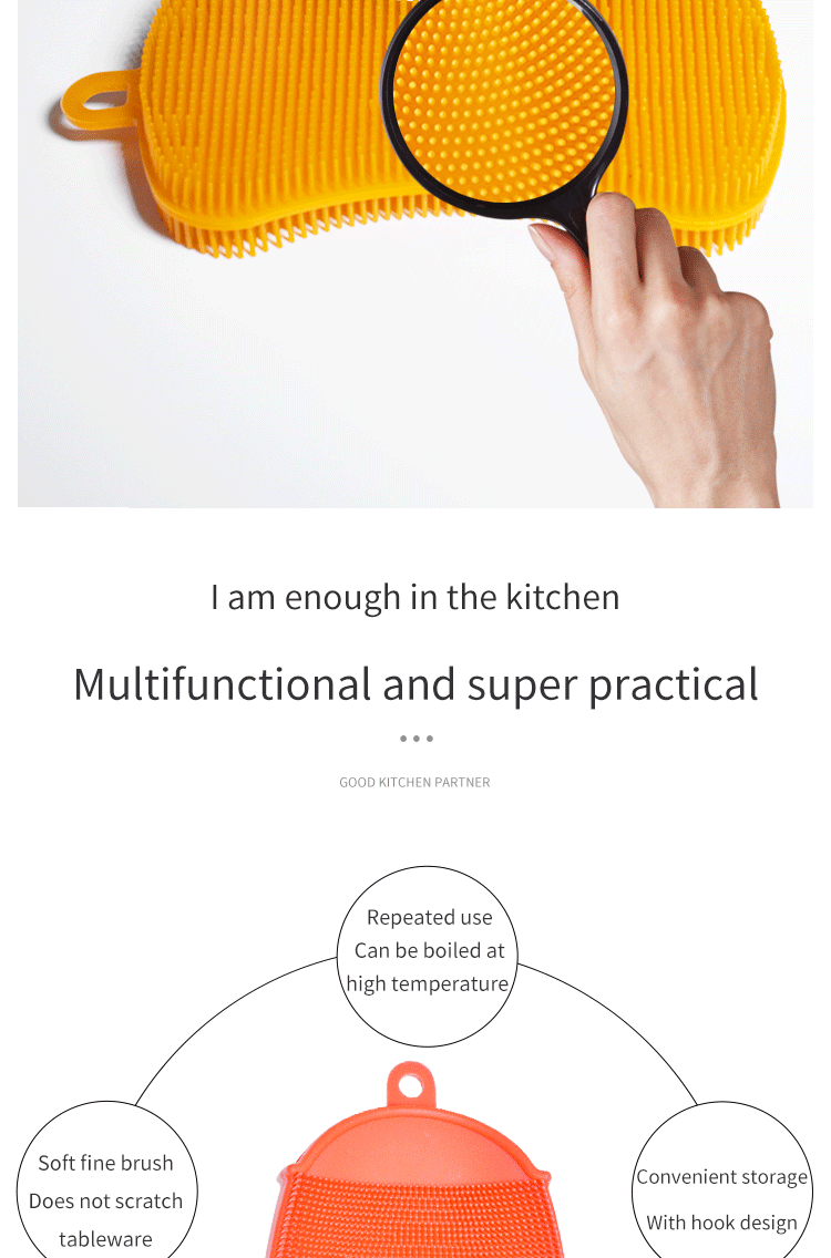 1, Multi-functional silicone cleaning brush, the use of 100% food grade silicone, safe and environmentally friendly, soft and wear-resistant, easy to leave debris, heat insulation, high temperature sterilization, easy to dry, easy to breed bacteria more hygienic.